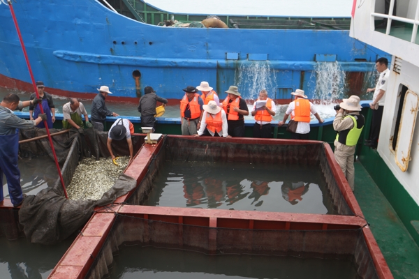 上午9时,增殖放流活动正式开始。东台公司、东台市海洋、公证等部门负责人、渔业技术专家及渔民代表乘坐渔政船从如东洋口港出发,前往东台市145渔区。省海洋渔业指挥部、东台市渔业技术站的专家对苗种品种、规格、数量及质量等指标进行现场检查,严格把关,保障放流苗种质量安全。随后,工作人员将688.636万尾大黄鱼和大黄鱼标志鱼苗种投放大海,苗种金额达330万元,剩余价值470万元的苗种,包括半滑舌鳎、黑鲷、菊黄东方鲀、文蛤、大竹蛏等将根据天气、潮汐等具体情况于七月底前放流完毕。省沿海开发集团为确保今年增殖放流活动的顺利进行,事先对放流工作进行了周密安排,活动细化到船只、人员、工具等各个环节,逐项落实到位。