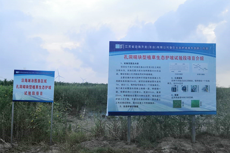 沿海集团农业企业都位于沿海滩涂围垦区域,土质均为粉砂土,粉砂土颗粒细小,遇水易流失,如何提高护坡工程效益,降低沟渠清淤、护坡维修的周期频率,节约维修成本,更好的服务垦区农业生产是垦区生态护坡青年创新工作室主攻的问题。工作室根据垦区粉砂土的特性,因地制宜针对滩涂围垦区域,结合理论研究,确定了实际护坡效果好的砌块型式和适合垦区盐碱土生长的植被,形成了《滩涂围垦区域孔洞砌块型植草护坡设计施工导则》,用于指导垦区生态护坡的前期设计和具体施工。